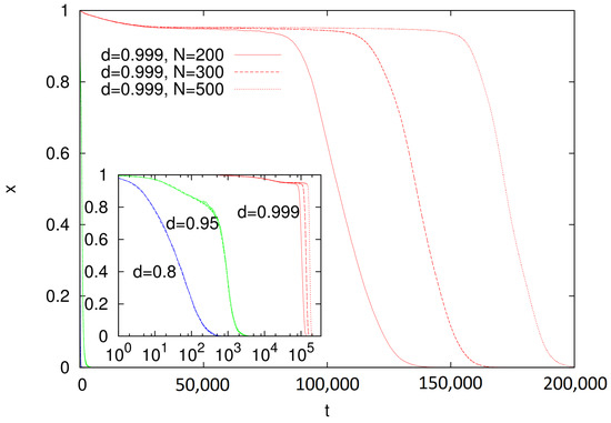 It is interesting to examine the evolution of our model for . In particular, for , simulations showed that the fraction of mobile agents x dropped to 0, but on a time scale that showed pronounced size dependence (Figure 4). For and 0.95, no such dependence was observed (inset in Figure 4).