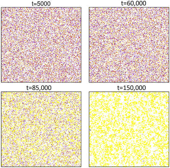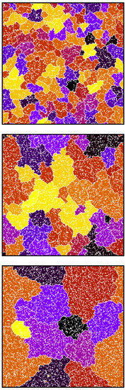 In this subsection, we describe our results in a low-density regime, and as a representative value, we chose and . Simulations showed that, in this case, after a relatively short transient, agents rearranged and formed monolingual clusters separated from each other (Figure 2).