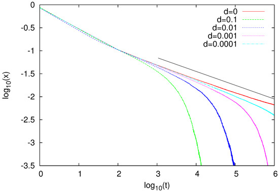 Time dependence of fraction x of bilingual agents calculated for , , and several values of mobility d. Solid straight line has slope corresponding to , and some bending of our data indicates that asymptotic decay for might be even slower than that. Presented results were averaged over 100 independent runs.