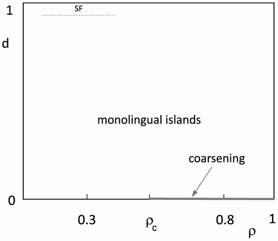 phase diagram as inferred from our simulations. In the largest portion of the phase diagram, the final state was quickly reached, comprising finite-size monolingual islands. We expected power-law coarsening only for and , and for , the coarsening was probably slower than due to random dilution. For d very close to 1, we expected the regime where the dominant language is formed via spontaneous fluctuation (SF, dashed line is not in scale).