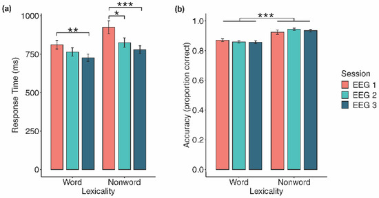 We analyzed word and nonword trials separately to directly compare with the BLP results [2], using 2 (lexicality: word, nonword) by 3 (EEG session: Session 1, Session 2, Session 3) repeated measures ANOVAs for RT and accuracy. For any resulting significant interactions, follow-up analyses of simple main effects were conducted with Bonferroni correction (α = 0.017).