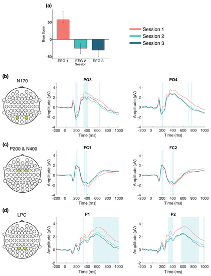Across session ERP results. Electrodes shown are representative of each effect. Highlighted areas in the ERP waveforms indicate the time points when the difference was reliable, as determined by bootstrap resampling. (a) Task PLS analysis differentiated between Session 1 versus Sessions 2 and 3. Error bars represent 95% confidence intervals. (b) N170 showing more negative amplitude in later sessions. (c) P200 (first highlighted area) and N400 (second highlighted area) showing more positive amplitude in later sessions. (d) LPC showing less positive amplitude in later sessions. Head plots in (b)–(d) indicate locations of electrodes shown.