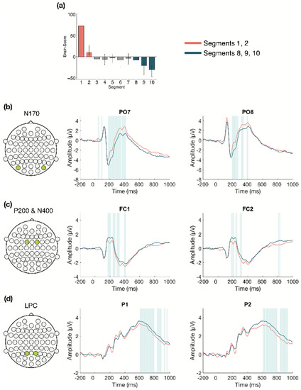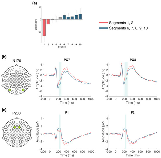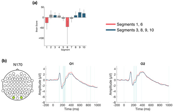 The second LV (p < 0.001; Figure 7) differentiated between Segments 1 and 6 compared to Segments 3, 8, 9, and 10. This analysis revealed a pattern of change where N170 amplitude during Segments 3, 8, 9, and 10 was more negative than during Segments 1 and 6. This difference was stable between 185–215 ms and was localized to bilateral occipital electrodes.