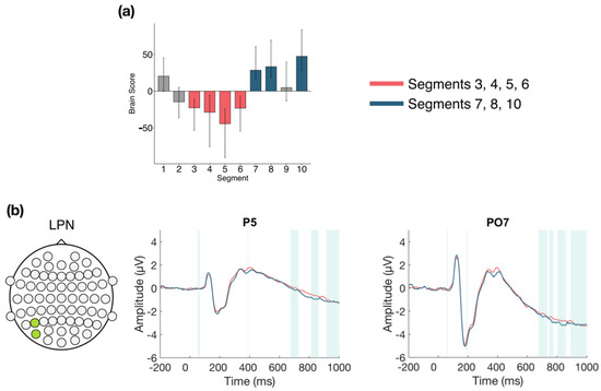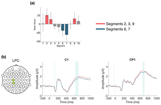 The second LV (p = 0.004; Figure 4) differentiated between the beginning and end of Session 1 (Segments 2, 3, and 9) and the middle of the session (Segments 6 and 7), and revealed that LPC amplitude decreased in the middle of the session, compared to the beginning and end. This difference was stable between 615–700 ms at mainly left central and centro-parietal electrodes. However, the results showed that the LPC amplitude increased overall within Session 1, due to the increase observed in the first LV (Figure 5a), and the increase from the middle to end of the session in the second LV (Figure 5b).