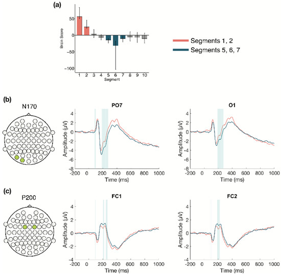 Within session ERP results for Session 2 (LV1). Electrodes shown are representative of each effect. Highlighted areas in the ERP waveforms indicate the time points when the difference was reliable, as determined by bootstrap resampling. (a) Task PLS analysis differentiated between the beginning and middle of Session 2. Error bars represent 95% confidence intervals. (b) N170 showing more negative amplitude later in the session. (c) P200 showing more positive amplitude later in the session. Head plots in (b,c) indicate locations of electrodes shown.