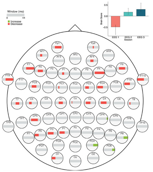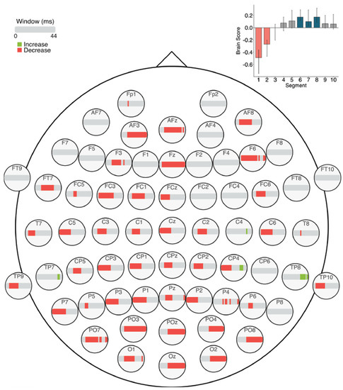 The second LV (p = 0.002) differentiated between the beginning (Segments 1, 3, and 4) and end of the session (Segments 8 and 9). Across the session, MSE decreased in fine scales (2–20 ms windows) but increased in coarse scales (24–44 ms windows). The decreases were located mainly in left posterior electrodes, with additional effects in bilateral anterior electrodes. The increases occurred in bilateral frontal, central, and parietal electrodes.