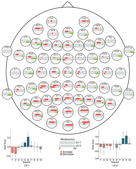 To analyze the ERP and MSE data, task partial least squares (PLS) analysis was used in MATLAB (R2014a; http://www.rotman-baycrest.on.ca/index.php?section=345; accessed on 21 November 2018) [18,62,63,64]. PLS is a data-driven multivariate analysis technique that operates on the entire data structure at once, identifying patterns of maximal covariance between ERPs/MSE and conditions across all electrodes and timescales simultaneously. Task PLS is similar to principal components analysis in that a priori contrasts are not specified. Instead, latent variables (LVs) showing similarities or differences between experimental conditions are identified. LVs are extracted in order of highest to lowest amount of covariance explained between conditions and neural activity. Each LV contains three vectors: design saliences identify a contrast of the similarities and differences between conditions; electrode saliences identify a particular pattern of electrodes and timescales that are most related to the condition differences; the singular value represents the strength of the effect expressed by the LV, i.e., the proportion of covariance accounted for.