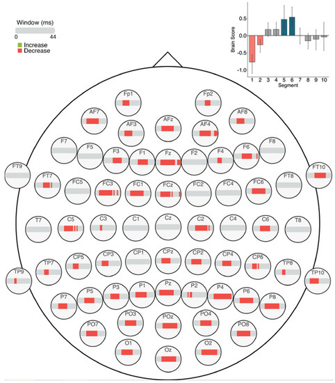 The task PLS analysis performed on the 10 segments of trials in Session 2 identified two significant LVs (α = 0.008; Figure 12). The first LV (p < 0.001) differentiated between the beginning (Segments 1 and 2) and middle of the session (Segments 5 and 6). This revealed widespread MSE decreases across the scalp from the beginning to the middle of the session, similar to the Session 1 results. Mid-scale decreases (10–30 ms windows) occurred mainly in left anterior and bilateral posterior electrodes, and coarse scale decreases (30–44 ms windows) were clustered in occipital and occipito-parietal electrodes. No MSE increases occurred.