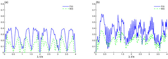 LQFI and BDE dynamics when the initial cavity field is in the B-GCS with , small initial coherent intensity , and the qubit–qubit coupling effect is absent. The decoherence effect is shown with different values in (a) and in (b).