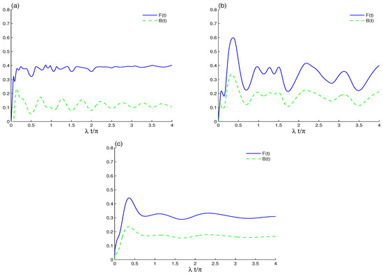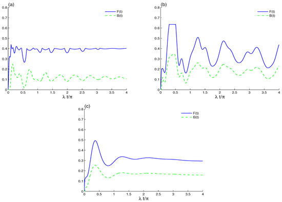 LQFI and BDE dynamics when the initial cavity field is in the B-GCS with and the initial coherent intensity in the presence of the intrinsic decoherence effect in (a,b), in (c). The qubit–qubit coupling effect is shown with different values in (a) and in (b).