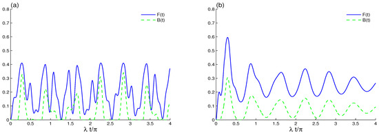 LQFI and BDE dynamics in the case where the initial cavity field is in the even B-GCS () with the initial coherent intensity and the intrinsic decoherence is absent. With different values of qubit–qubit coupling, in (a) and in (b).