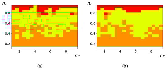 Maps of the leadership of strategies based on the calculation of S, Three calculation results (a–c) are demonstrated. These calculations correspond to three independent simulations with the same parameters and show that due to the stochasticity inherent in the model, the maps change quantitatively, but not qualitatively. The color denotes the winner for the corresponding initial values of m0 and η0. Orange, yellow, and red colors correspond to the O-, L-, and M-strategies, respectively. Dm = Dη = 0.1, .