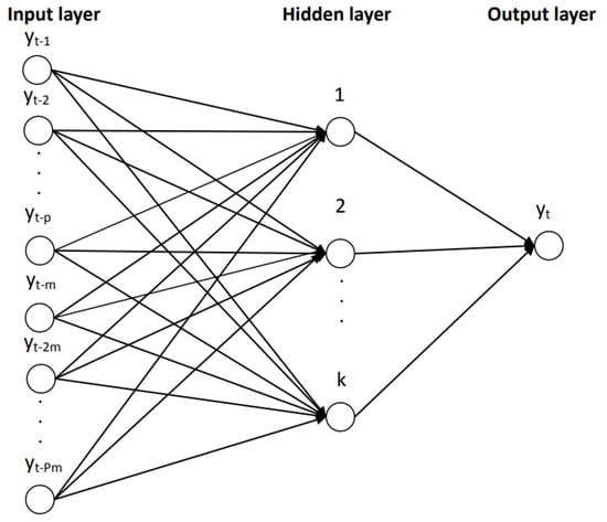 A diagrammatic representation of the NNAR(p,P,k)m model. Source: Touplan []. NNAR: neural network autoregression.
