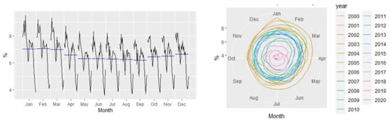 When choosing models, it is common practice to split the available data into two portions, training and test data, where the training data are used to estimate any parameters of a forecasting method and the test data are used to evaluate its accuracy. Therefore, the training set or “in-sample data” was set to the period 2000M01–M2017M12, and the test set or the “out-of-sample data” was set to the period 2018M01-2020M12. The forecast of unemployment rate will rely on the next two years of the period 2021–2022.
