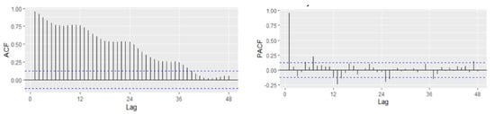 Before fitting a particular model to time series data, the stationarity of a series must be checked []. In order to identify if the time series in stationary, the graphical representation of the series together with the correlogram of the series in level, Bartlett test, and Ljung–Box test can be applied. In order to test if the series has a unit root, the Augmented Dickey–Fuller and Philips–Perron tests can be used. To obtain a stationary time series, the corresponding value of d is estimated, in the case of a non-stationary series in mean, the series is differentiated, and in the case of a non-stationary series in variance, the series is logarithmized.