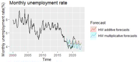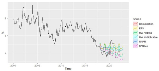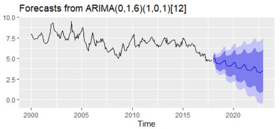 The autoregressive integrated moving average (ARIMA) models were introduced by Box and Jenkins [], also developing the practical process to select the most suitable ARIMA model. ARIMA models are more secure in case of short-term forecasts compared to long-term forecasts []. For seasonal and non-seasonal data, the SARIMA (seasonal model autoregressive integrated moving average) is used. The SARIMA model is an extension of the simple ARIMA models, being used for inflation forecasting [,,], for exchange rate forecasting [,], for tourist arrivals and income forecasting [,], as well as for unemployment forecasting. The literature includes a lot of studies on forecasting using ARIMA models, respectively the Box–Jenkins methodology, which is widely used by many researchers to highlight future unemployment rates [].