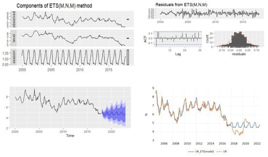 Other forecasts of the unemployment rate in Romania were realized by Bratu and Marin [] using several techniques: econometric, exponential modeling, smoothing technique, and moving average method; of these, predictions based on the exponential smoothing technique recording the highest degree of accuracy. Voinegu et al. [] predicted the unemployment rate using Holt’s improved model, the monthly series being constructed and disseminated in three forms: adjusted, seasonally adjusted, and trend adjusted. Other predictions used the Kalman approach, the Kalman filter being appropriate for calculating the natural unemployment rate []. In the short term, Zamfir [] modeled the unemployment rate using stochastic models.