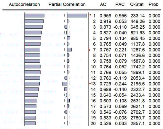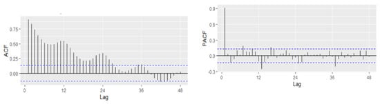 Another important feature that needs to be investigated for a series exhibiting a seasonal pattern under the stationarity condition is to test for the presence of a seasonal unit root using the HEGY test []. The HEGY test is used in case of a seasonal and non-seasonal unit root in a time series. A time series yt is considered as an integrated seasonal process if it has a seasonal unit root as well as a peak at any seasonal frequency in its spectrum other than the zero frequency.