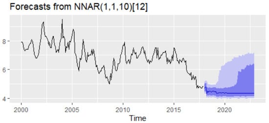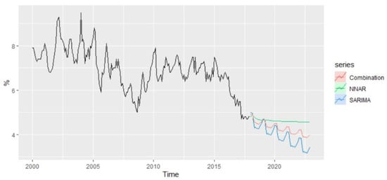 Wang et al. [] used back propagation neural networks (BPNN) and the Elman neural network to predict unemployment rate. Neural networks are also used by Peláez [] to forecast the unemployment rate, together with econometric models.