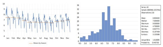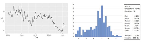 The phenomenon of unemployment is the result of the dysfunctions of the economy, in the field of employment, being present both in the period of market economy transition and in the period of economic growth []. Unemployment is a very important labor market issue, being a mismatch between the labor demand and supply. This indicator has major social and economic implications, being one of the factors to be examined in macroeconomic growth and very important in comparing the country’s economic performance from a work perspective [], affecting people’s living standard and the nation’s socio-economic status.