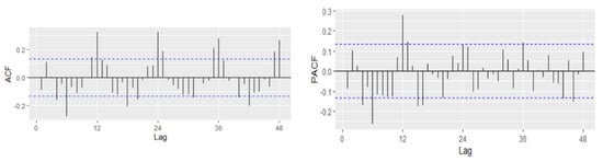 Once the stationarity has been achieved, the identification stage involves determining the proper values of p, P, and q, Q based on the correlogram of the stationary series (ACF and PACF plot). Checking the ACF and PACF plots, we should both look at the seasonal and nonseasonal lags. Usually, the ACF and the PACF have spikes at lag k and cut off after lag k at the non-seasonal level. The ACF and the PACF also have spikes at lag ks and cut off after lag ks at the seasonal level. The number of significant spikes suggests the order of the model [].