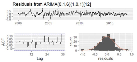 Predictions of unemployment rate in the world using the ARIMA model were made by Chih-Chou and Chao-Ton [], Etuk et al. [] and Nkwatoh [] in Nigeria using the ARIMA and ARCH model, Kanlapat et al. [] in Thailand, Nlandu et al. [] in Barbados, using the seasonal integrated autoregressive moving average model (SARIMA), Dritsakis and Klazoglou [] in the USA using SARIMA and GARCH models, and Didiharyono and Syukri [] in South Sulawesi using the ARIMA model.