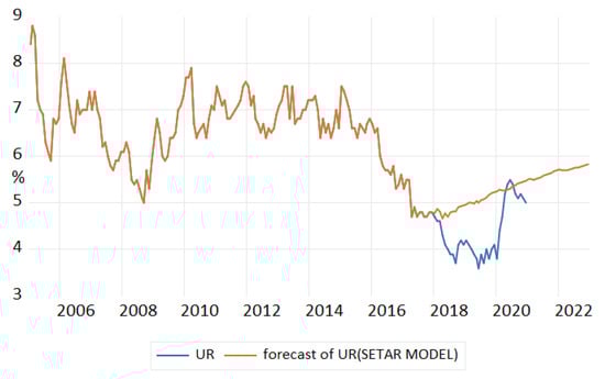 As the asymmetric behavior of unemployment rate can be modeled using a nonlinear time series model, Skalin and Terasvirta [] proposed STAR. Peel and Speight [] forecasted the unemployment rate in the UK using self-exciting threshold autoregressive (SETAR) models and an autoregressive model, in terms of RMSE, SETAR models registering better forecasting performance. Koop and Potter [] used threshold autoregressive (TAR) in order to forecast the US unemployment rate, Johns [] forecasted the unemployment rate using AR(4), AR(4)-GARCH(1,1), SETAR(3,4,4), and neural network, highlighting that SETAR is the best model.