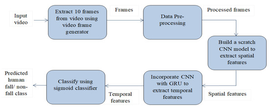 Among all kinds of human movements, to classify fall events, we need to consider temporal features along with spatial features. The recurrent neural network can extract temporal features by remembering necessary information from the past. However, during this operation, it faces vanishing and exploding gradient problems. In our model, we have used the gated recurrent unit (GRU) network to solve this problem of RNN using an update gate and a reset gate, which are the vectors to decide what information needs to be passed as output. These gates can be trained to hold information from long ago, without erasing new input through time but pass relevant information for prediction to the next time steps. GRU gives a much better result than a long short term memory (LSTM) cell because of its simple architecture.