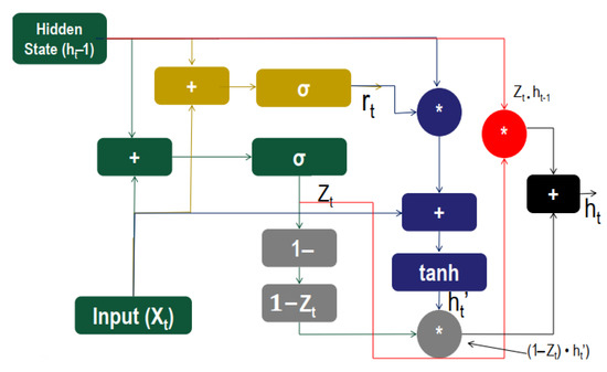 Figure 5 depicts the architecture of a GRU cell. There are three gates in GRU called the Update gate, the Reset gate, and the Current memory gate, which has no internal cell state. The Update gate identifies significant preceding information from the antecedent time steps, which is required to be passed along with future information. The reset gate decides how much of the past information needs to be forgotten. The current state gate determines the current state information along with the relevant information from the past.
