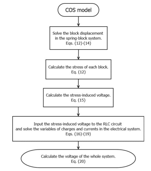 To elucidate the process of how the simulated voltages are generated in the coupled mechanical–electrical system, Figure 2 shows the flowchart of the COS model. Based on Equations (12)–(14), we first solve the block displacement of the spring-block system. Subsequently, we calculate the stress of each block based on Equation (12). Then, we calculated the stress-induced voltage by using Equation (15). Given the obtained stress-induced voltage, we can solve the variables of charges and currents in Equations (16)–(19). Finally, we obtained the simulated voltages of the spring-block system through Equation (20).