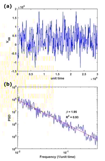 In this study, we set to be 128, to be 30, to be 1.5, and was randomly assigned between 1 and 3.5 for each block. In addition, we set diverse values to , , and to investigate the influence of changing the electrical parameters on the temporal dynamics of the simulated voltages . For instance, Figure 3a,b shows the time series and its power spectral density (PSD), respectively, of the voltages simulated under the parameters of , , and . We observed that such time series were similar to real ones (e.g., in comparison to those in Figure 2 in [78] at a laboratory scale and those in Figure 2 in [79] at a geological scale). In Figure 3b, the PSD of the simulated voltages conforms to the noise with the power-law scaling of ; the scaling for geoelectrical signals usually ranges from 1 to 2 [66,67,79]. Therefore, the COS model can reproduce pulse-like behaviors in the time domain and the scaling behavior in the frequency domain.
