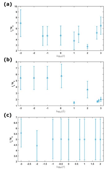 Besides, we defined a statistical measure of complexity, which can be expressed as the product of Fisher information measure and Shannon entropy power () [100]. The statistical complexity represents a combined effect of both local and global factors, offering an evaluation of the organization, structure, and correlation in a system or time series. Figure 5 shows the complexity versus the capacitance (Figure 5a), inductance (Figure 5b), and resistance (Figure 5c). All the results showed that . First, we observed that the complexity versus the capacitance shows the lowest value of around 3 when . As for the inductance, the complexity exhibits two regimes separated by , showing that the mean value is around 5.5 when whereas that is mostly 2 when . In terms of the resistance, the complexity changes insignificantly with , most of which show a mean value of five.