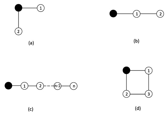 The illustrations of the system networks. (a) the double-component model of independent degradation, (b) the double-component model of correlated degradation (c) the chain-type graph model (d) the graph model contains loop. The filled and the numbered circles represent the degradation source and normal components, respectively.