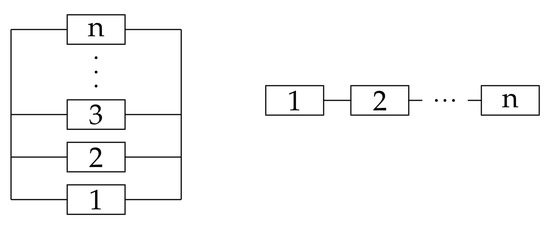 where is the survival probability of the homogeneous distribution , and are the Lagrange multipliers with . The factor 3 in Equation (20) is added to simplify the following calculation and note that it does not affect the distribution determined by the MaxEnt. The first term in Equation (20) is the single-component moment, and the second term is the moment for the series structure of two components. These constraints are directly obtained with the reliability block diagram presented in Figure 5.