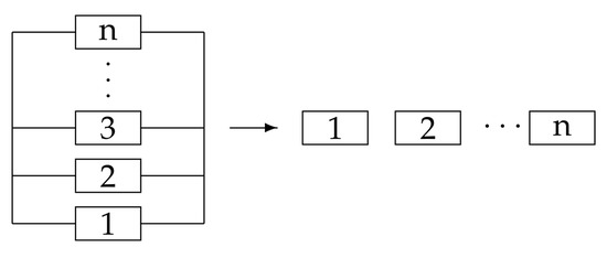 In the chain-type network, the lifetime of can be decomposed into the remaining lifetime of each component as . Each interval in the summation is associated with the hazard rate of the corresponding component. This implies that if the n components are on one path, the further reduction of the parallel type diagram can be done according to Figure 3. Since the path is unique for any tree graphs, the path information is further reduced to lots of single-component information.