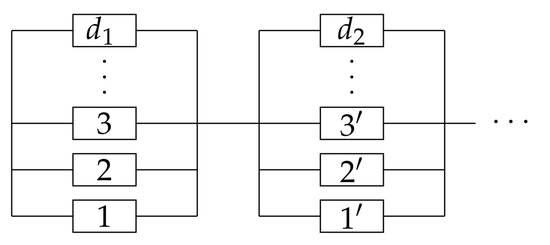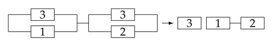 With a loop structure in a network, the degradation path is not unique, which leads to a parallel-series type diagram. The diagram could not be reduced to single blocks. Consequently, the constraints for the MaxEnt is no longer linear. Assume there are m paths from the target component to the source, and the lengths of the paths are denoted by . The reliability block diagram is presented in Figure 4.