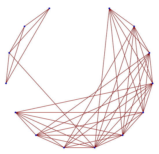 The performance of the approach is presented with the simulation of the repairable model on 10,000-node Watts–Strogatz small world [24] with the reconnected probability and the degree . The sub-graph of the generated Watts–Strogatz small world is presented in Figure 6 for illustration. To clearly demonstrate the connection 14 nodes are shown.