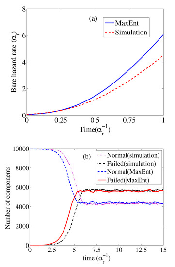 The performance of the MaxEnt method. (a) The inference of the bare hazard rate. (b) The forecast of the number of normal and failed components by MaxEnt. The parameters of simulation are . The simulation result shows that the total spreading last about , the data with an initial . The data of 27 single-component samples are used to estimate the moments.