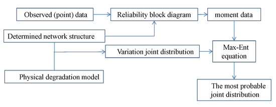 The application of the approach involves the following steps in general as presented in Figure 8. (1) Form a network with nodes representing the multi-component system, (2) build the variational joint distribution based on the network, (3) collect the observed lifetime (recovery duration) data of the components as testable information, (4) process the observed data according to the reliability block diagram and calculate the moments, and (5) maximize the entropy of the variational joint distribution with the moment constraints. For many artificial systems, the network structure is usually known, and the network can be constructed accordingly among the components. For the systems with an unknown structure, the inference of network structure is also needed. Such inference is not the subject of this paper. Relevant discussions can be found in [29,30] for network modeling. Combination the inference of network and dynamics will be studied in future work.