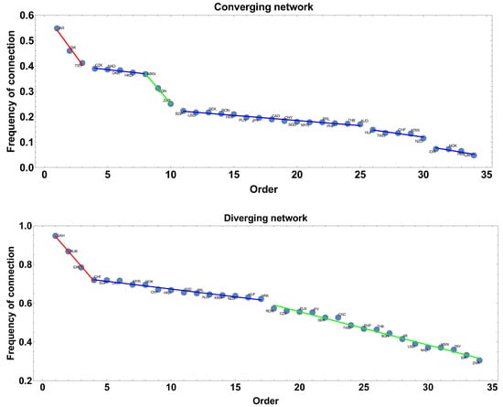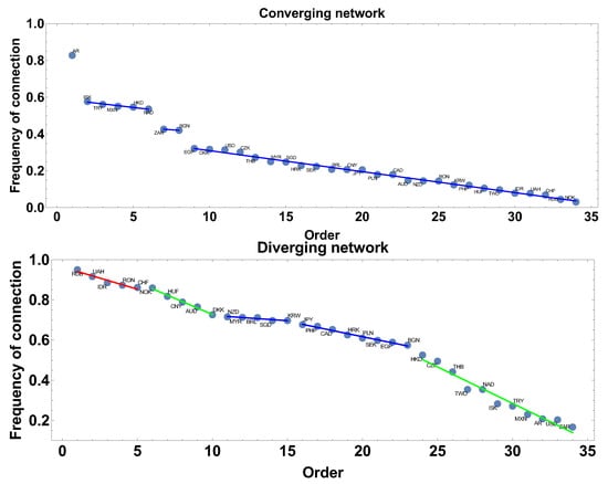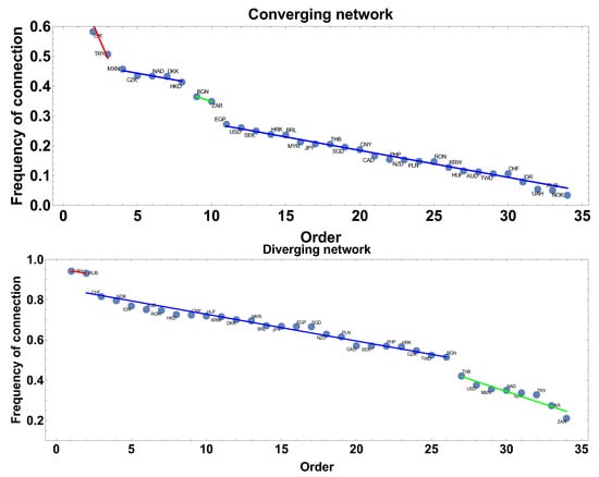 In the case of the network construction based on the converging time series, i.e., the correlation strength  the frequency of connection ranks are presented in Figure 2 and denoted as the converging network. In this case, six groups can be distinguished. Taking more detailed analysis into account, the following groups can be pointed out: the first, marked by the red line AR, ISK, and TRY, and the second, denoted by the blue line, consists of CZK, NAD, DKK, HKD, and MXN. The third group, marked by the green line consists of two members BGN, ZAR. The fourth group is the biggest EGP, USD, SEK, RON, HRK, PLN, JPY, CAD, CNY, SGD, MYR, BRL, PHP, THB, and AUD. The two other groups are formed by HUF, TWD, CHF, KRW, NZD and IDR, NOK, RUB, UAH. Although both graphs are, in some sense, complementary, divergent correlation graphs are constructed under the condition that on the graph there are currencies with , while the divergent graph under condition  the graphs in Figure 2 are not simple mirror images of each other. This is because, in the analysis, the whole correlation matrix is investigated and a given currency may be present on both types of graphs at the same time (it might be convergent with respect to one time series and divergent with concerning another). Particularly interesting are the groups denoted by the blue lines. These groups consist of currencies with similar frequency of being present in the network (divergent or convergent respectively), so the method introduces a natural categorization of time series.