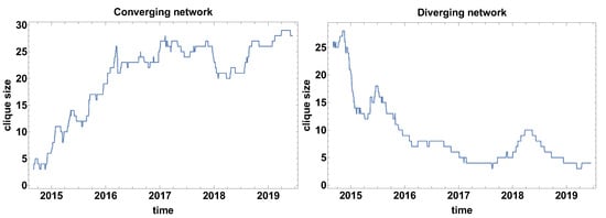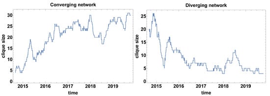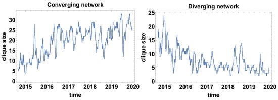 Figure 15 presents the biggest clique size evolution for the time window  days. When comparing to the previously discussed cases, i.e.,  days, the smoothing effect of the time window size is clearly visible. In this case, the biggest clique size for the converging time series network is asymptotically increasing with the exception in the middle of 2018, which can be related to the Chinese stock market crisis. An analogous maximum is observed in the graph presenting the biggest clique size evolution for the diverging network shown in Figure 15.