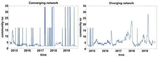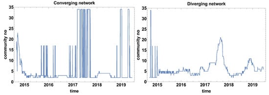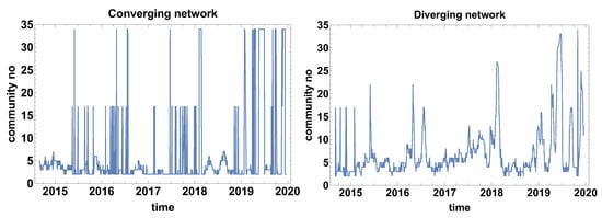 The graph presenting the evolution of the community size for the diverging network (Figure 4) differs significantly from the converging network. In this case, except for the initial part at the end of 2014, the two-level behaviour is not observed. Therefore, the diverging network seems to be more robust to the network switching effect. Similarly to the converging network, the “baseline” of the community number can be distinguished (2–5 communities). Several clear maximums can be distinguished in the case of the diverging network quantity of community evolution: June 2015, April and July 2016, February 2018, and several maxima in 2019. 2019 was the most unstable year out of those analysed when many times the network was split into a big number of small communities.