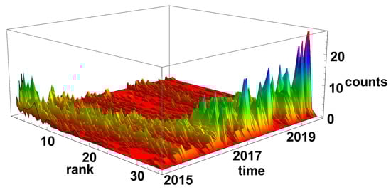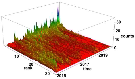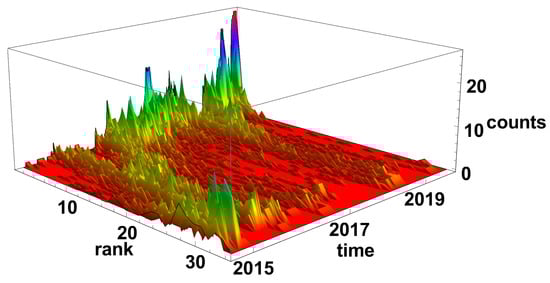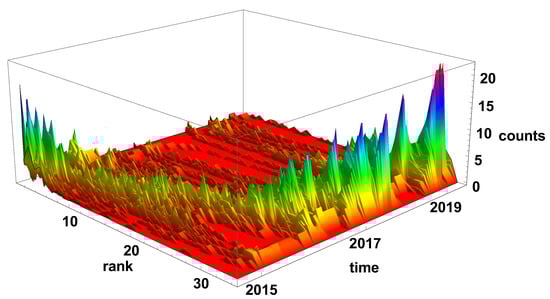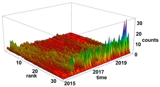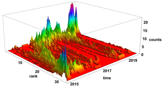 The node rank histogram evolution that were obtained for the time window  days are presented in Figure 17 and Figure 18. In both graphs, the change node rank structure is clearly visible. In the case of converging time series network, as in Figure 17, at the beginning of the analysed period, i.e., at the end of 2014 and in the first quarter of 2015 the low-rank nodes are prevailing in the network, while, from 2016, the high-rank nodes are dominating. Differently from the already analysed rank histograms evolutions for shorter time windows ( and  days) in the case of  days, the process of network transition from domination of low-rank nodes to high-rank nodes, prevailing network is a kind of continuous process. The transformation process lasts approximately a year when the nodes are gaining connections. The significant shift of the maximum position of the low-rank nodes is observed in mid-2018, probably due to the Chinese stock market crisis.
