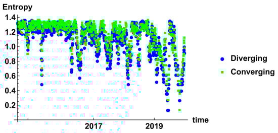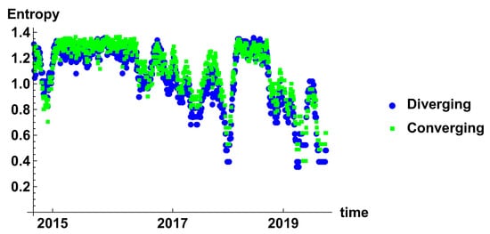 Figure 13 presents the entropy of the rank node distribution for the time window of  days. In this case, the influence of noise is significantly reduced. The different periods can be clearly distinguished. Initially, in 2015 the decrease of entropy is observed, which is the effect of domination of high rank nodes in the histograms. The period of stable high entropy follows, which lasts until the mid of 2016. Later, oscillation appears, which are combined with the decrease of the minimum value to achieve minimum in the beginning of 2018. In 2018, another period of maximum entropy is observed. It seems that level 1.4 is the maximum entropy observed in these networks and can be considered as a measure of the stability of the market. A significant lowering of the entropy may be considered as a signature of the crisis.
