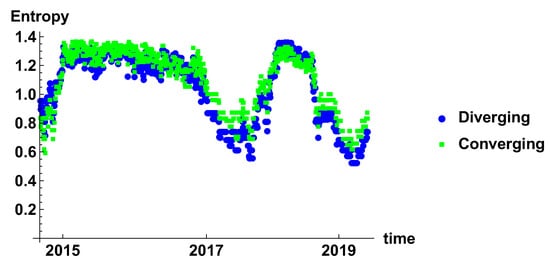 Evolution of the rank node entropy for diverging and converging networks. The time window size  days. The blue circles and green squares denote the entropy of diverging and convergent network respectively.