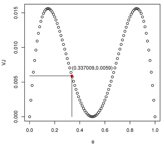 Table 1 gives the numerical values of with for the standard uniform distribution. It can be observed that , as stated in Proposition 8, and is increasing with respect to k for when n is odd (even). Furthermore, it is decreasing with respect to k for . Therefore, the median of order statistics has a minimum varextropy. It should be noted that, when n is even, both of the middle random variables of order statistics, are the median.
