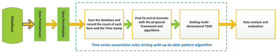 The purpose of the proposed TSARM-UDP algorithm is to mine the TSARs from time-series. The specific steps of the proposed algorithm are elaborated in the next section. The flowchart of TSARM-UDP is shown in Figure 3. Note that all data in this paper are time-series data with equal intervals.