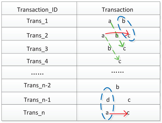 Assuming that we are trying to determine whether the itemset (a, c) is frequent, we have to calculate the value of this itemset. The red solid line represents the way that the numerator in the formula is calculated in the traditional method, which considers that only when the item a and c occurred at the same time can be counted. The green dotted line represents the method of calculating the numerator in Formula (5), which considers the lagged time T (T is considered as two here) of item a and c for time series data in an actual industry production situation. Similarly, the total valid transactions are changed due to considering T, because the transactions in the blue dotted circle cannot be counted in the process of calculating . Thus, the denominator in Formula (5) is .