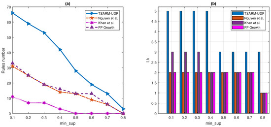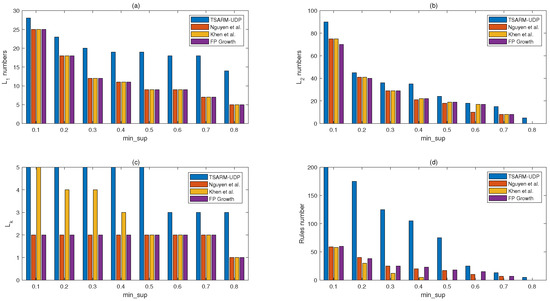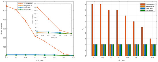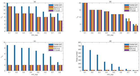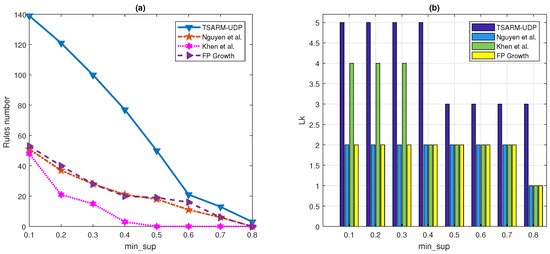 It is essential to compare the maximal itemsets and rule numbers for different values. Therefore, we compared the rule numbers and maximal itemsets that can be mined by the four methods when the values are 0.7 and 0.8, respectively. As shown in Figure 7a, more rules were mined by the proposed TSARM-UDP compared with the other methods. These rules can play a better role in decision-making. In Figure 7b, it can be clearly seen that the maximal itemsets mined by the TSARM-UDP are larger than other methods. In Figure 8, we set the and . Furthermore, the numbers of rules and that can be mined with different are compared. The experiment results shown in this figure can also draw the same conclusions as discussed in Figure 6.