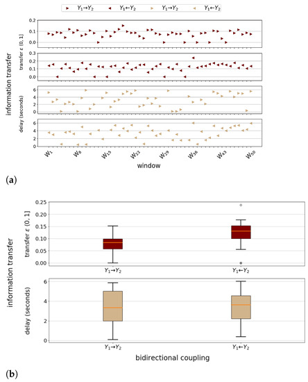 Transfer entropy () is an information-theoretic implementation of Wiener’s notion of causality applied to time series [9], whereby the cause precedes—and contains unique information about—the effect. Consider two stationary ergodic Markov processes X and Y (or and as below) and their corresponding time series and of M samples. Transfer entropy quantifies reduction in uncertainty about future states of a source process X, when passed states of a target process Y are observed in addition to passed states of X itself. As an asymmetric measure based on transition probabilities, transfer entropy naturally incorporates directional and dynamic information, which may imply causation between X and Y: